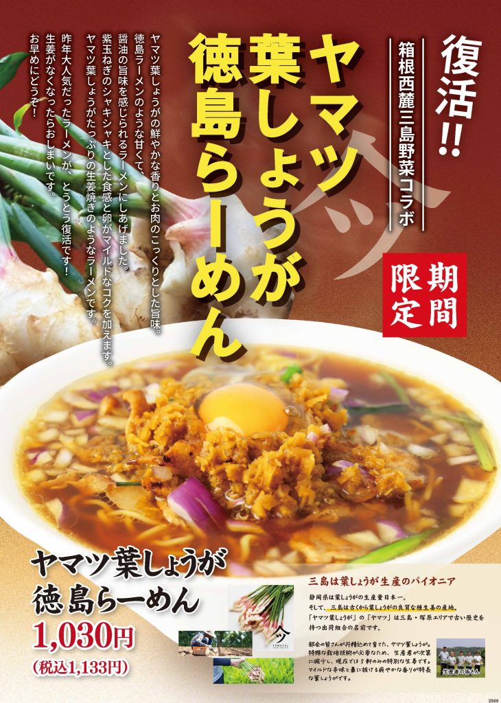箱根西麓三島野菜の生産者、ヤマツ部会の皆さんがつくる「ヤマツ葉しょうが」を使ったこちらのラーメン。